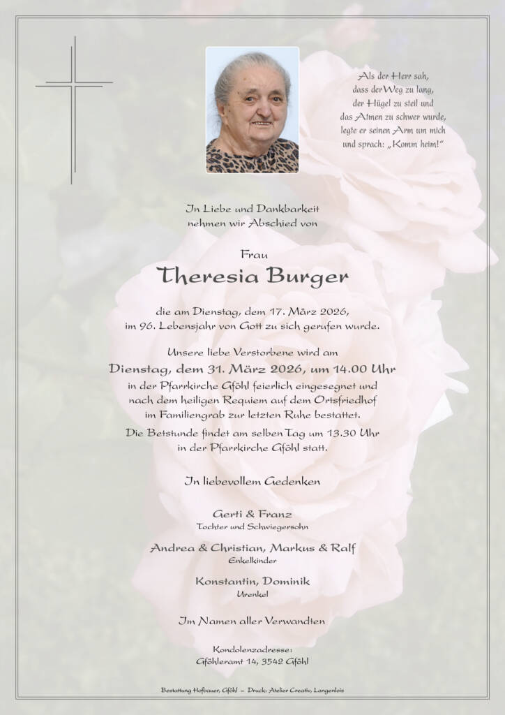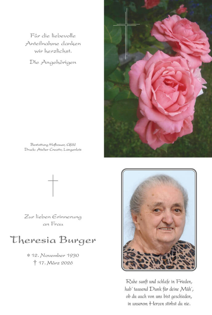 Theresia Burger * 12. November 1930† 17. März 2026 Begräbnis:Dienstag, 31. März 2026,um 14.00 Uhr in der Pfarrkirche GföhlBetstunde:Dienstag, 31. März 2026,um 13.30 Uhr in der Pfarrkirche Gföhl Download Parte Download Trauerbild Parte Trauerbild Kerzen Parte Trauerbild Kerzen Hier können Sie eine Kerze anzünden Label Name* Email Label Name* Email 14 Kerzen Inline Feedbacks View all comments Herta und Josef 16 Tage zuvor Ein Licht für die letzte Reise Maria Rumpelmayer 16 Tage zuvor Herzliche Anteilnahme von Maria Rumpelmayer Traude Strasser 15 Tage zuvor Aufrichtiges Beileid! Frieda und Alois 14 Tage zuvor Unser aufrichtiges Beileid Fam Alfred Simon 13 Tage zuvor Unser aufrichtiges Beileid Franz und Hermi Gruber 13 Tage zuvor Aufrichtiges Beileid der ganzen Trauerfamilie 🖤🕯️ Walter und Hildegard Lehmerhofer 12 Tage zuvor Unser aufrichtiges Beileid der ganzen Familie. Holzer Elfriede und Erich 11 Tage zuvor Aufrichtiges Beileid der ganzen Trauerfamilie Traude König und Fritz Steindl 10 Tage zuvor Unser aufrichtiges Beileid der lieben Trauerfamilie. Maria Dick und Lisl Zillner 10 Tage zuvor Unser aufrichtiges Beileid Wurzer Lia 9 Tage zuvor Mein Beileid und aufrichtige Anteilnahme der ganzen Familie. Markus 6 Tage zuvor Liebe Oma. Danke für Deine lebenslange Fürsorge. Jutta Kaindl 4 Tage zuvor Werte Trauerfamilie, meine aufrichtige Anteilnahme möchte ich hiermit ausdrücken! Helga und Ernst Knödlstorfer 1 Tag zuvor Unser aufrichtiges Mitgefühl