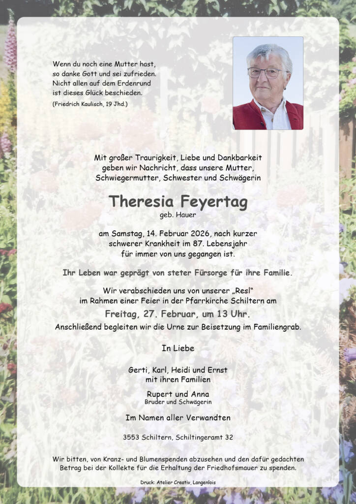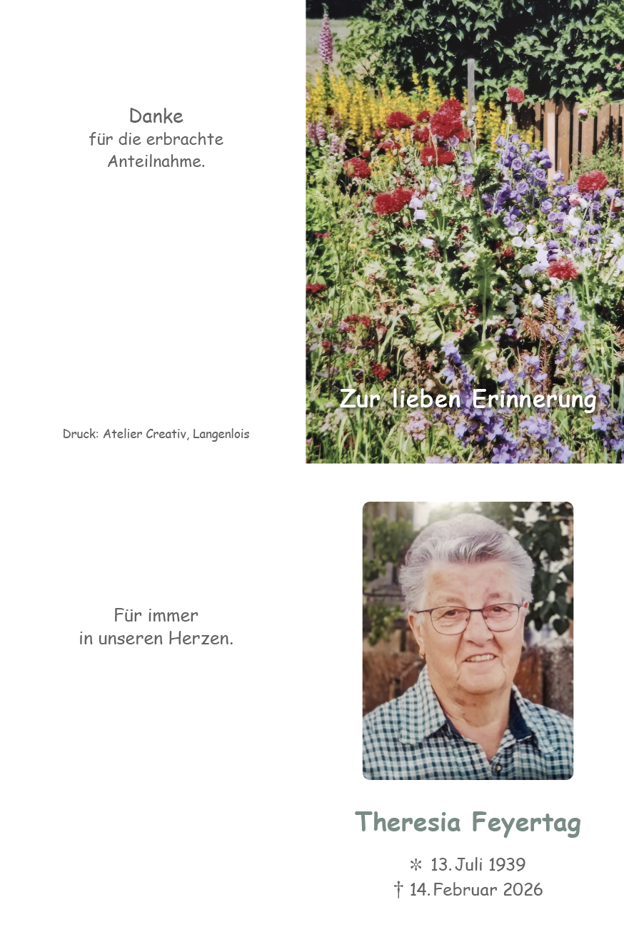 Theresia Feyertag * 13. Juli 1939† 14. Februar 2026 Urnenverabschiedung:Freitag, 27. Februar 2026,um 13.00 Uhr in der Pfarrkirche Schiltern Download Parte Download Trauerbild Parte Trauerbild Kerzen Parte Trauerbild Kerzen Hier können Sie eine Kerze anzünden Label Name* Email Label Name* Email 10 Kerzen Inline Feedbacks View all comments Andrea 13 Tage zuvor Ein Licht für deine letzte Reise – ruhe in Frieden. MeinUnsere aufrichtige Anteilnahme Familie Fletzer 13 Tage zuvor Mein aufrichtiges Beileid entbietet Helga Fletzer Gföhl Fam. Korseska 13 Tage zuvor Unser innigstes Beileid Florian, Christa und Lukas Ingrid, Jaro u. Christopher 13 Tage zuvor In liebevollem Gedenken – ruhe in Frieden. Günter u. Hildegard Bruckner 13 Tage zuvor Ein neuer Stern am Himmel Ruhe in Frieden ! Karl Ehn 12 Tage zuvor Unser herzliches Beileid, ruhe in Frieden Maria Rumpelmayer 11 Tage zuvor Herzliches Beileid Maria Rumpelmayer 11 Tage zuvor Herzliches Beileid von Maria Rumpelmayer Walter und Hildegard Lehmerhofer 9 Tage zuvor Aufrichtiges Beileid der gesamten Familie. Hannes Schmöger samt Mutter 4 Stunden zuvor Wir danken für die jahrelange Treue und entbìeten unser aufrichtiges Beileid der gesamten Familie!