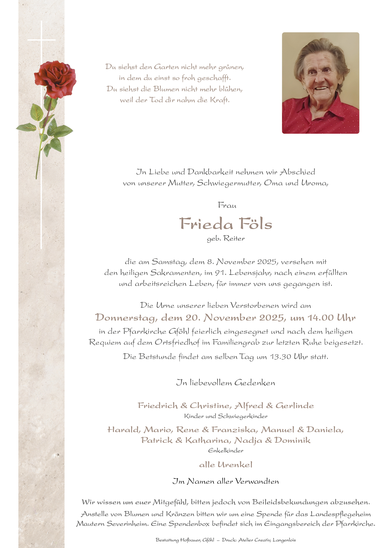 „Menschen, die wir lieben, bleiben für immer, denn sie hinterlassen Spuren in unseren Herzen.“ Liebe letzte Grüße, das Team des PBZ Mautern