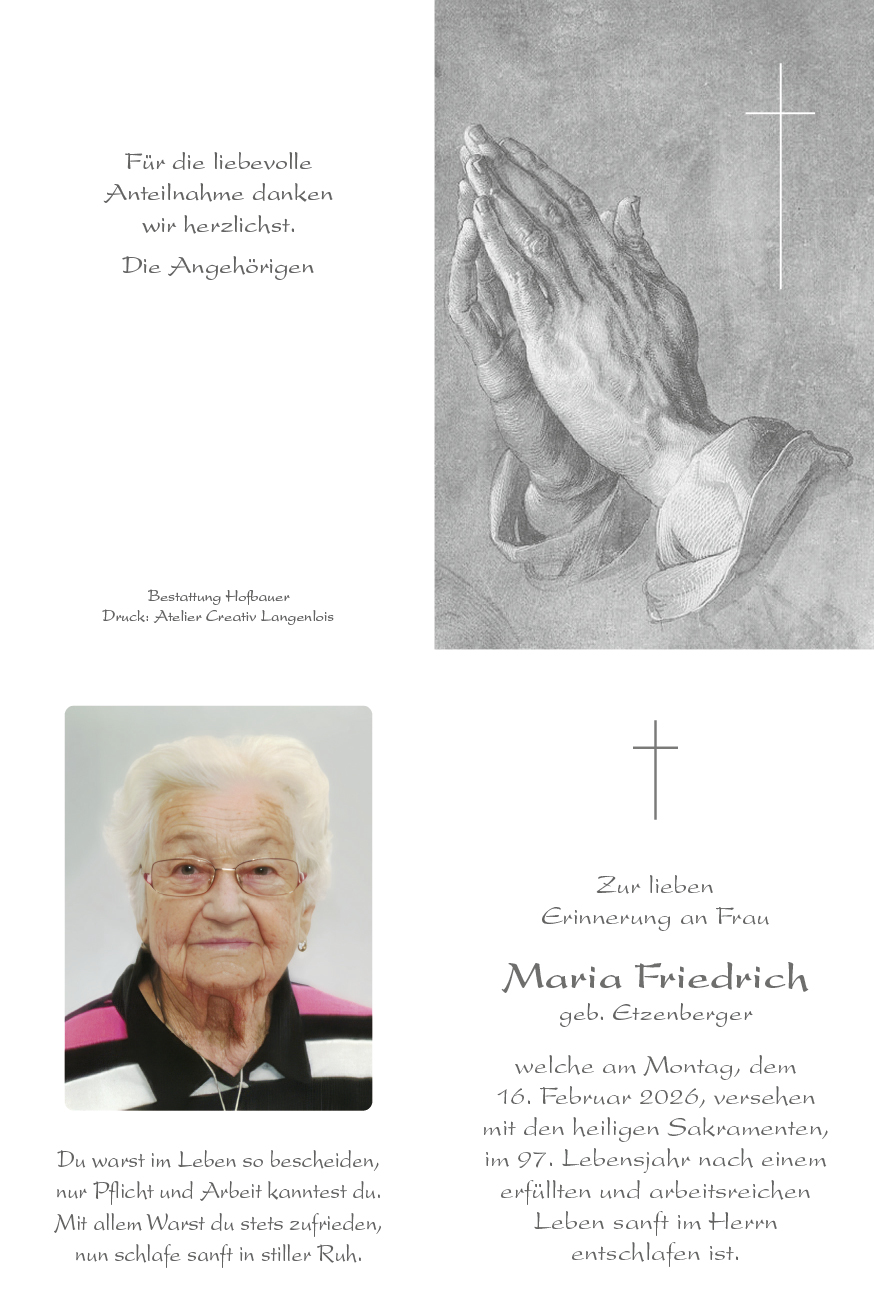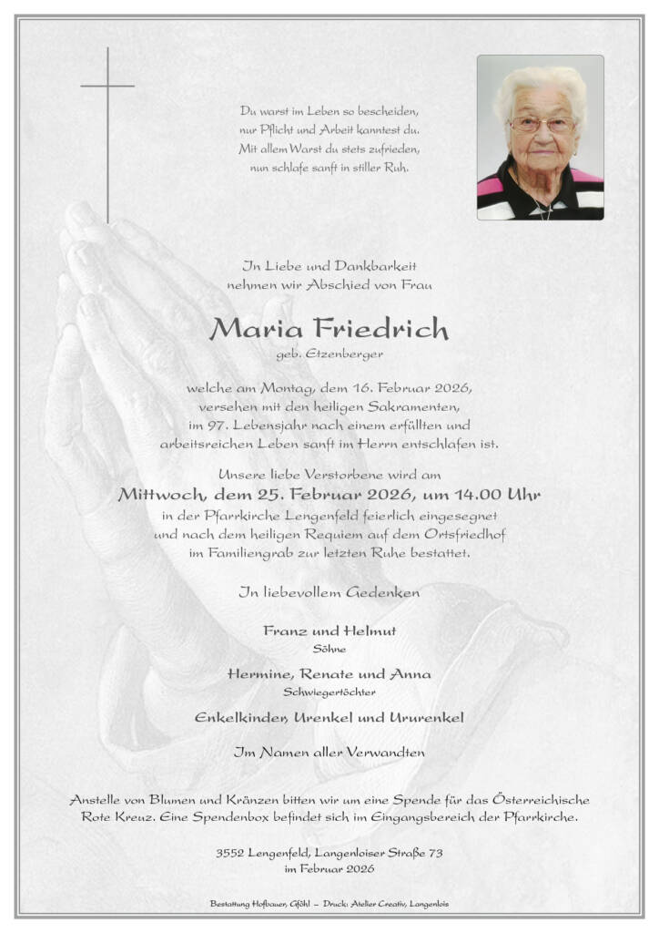 Maria Friedrich * 14. Jänner 1930† 16. Februar 2026 Begräbnis:Mittwoch, 25. Februar 2026,um 14.00 Uhr in der Pfarrkirche Lengenfeld Download Parte Download Trauerbild Parte Trauerbild Kerzen Parte Trauerbild Kerzen Hier können Sie eine Kerze anzünden Label Name* Email Label Name* Email 7 Kerzen Inline Feedbacks View all comments Hedwig Köllersberger 15 Tage zuvor Aufrichtiges Beileid Elfriede und Gerhard Penz 15 Tage zuvor „Wenn die Sonne des Lebens untergeht, leuchten die Sterne der Erinnerung.“ Robert und Anita Gwiß 15 Tage zuvor Unser aufrichtiges Beileid der gesamten Familie. Sabine 14 Tage zuvor Ruhe in Frieden Oma 🕯 PBZ Mautern 13 Tage zuvor „Menschen, die wir lieben, bleiben für immer, denn sie hinterlassen Spuren in unseren Herzen.“ Liebe letzte Grüße, das Team des PBZ Mautern Wurzer Lia 12 Tage zuvor Mein Beileid und aufrichtige Anteilnahme. Johann Gössl 8 Tage zuvor Ruhe in Frieden