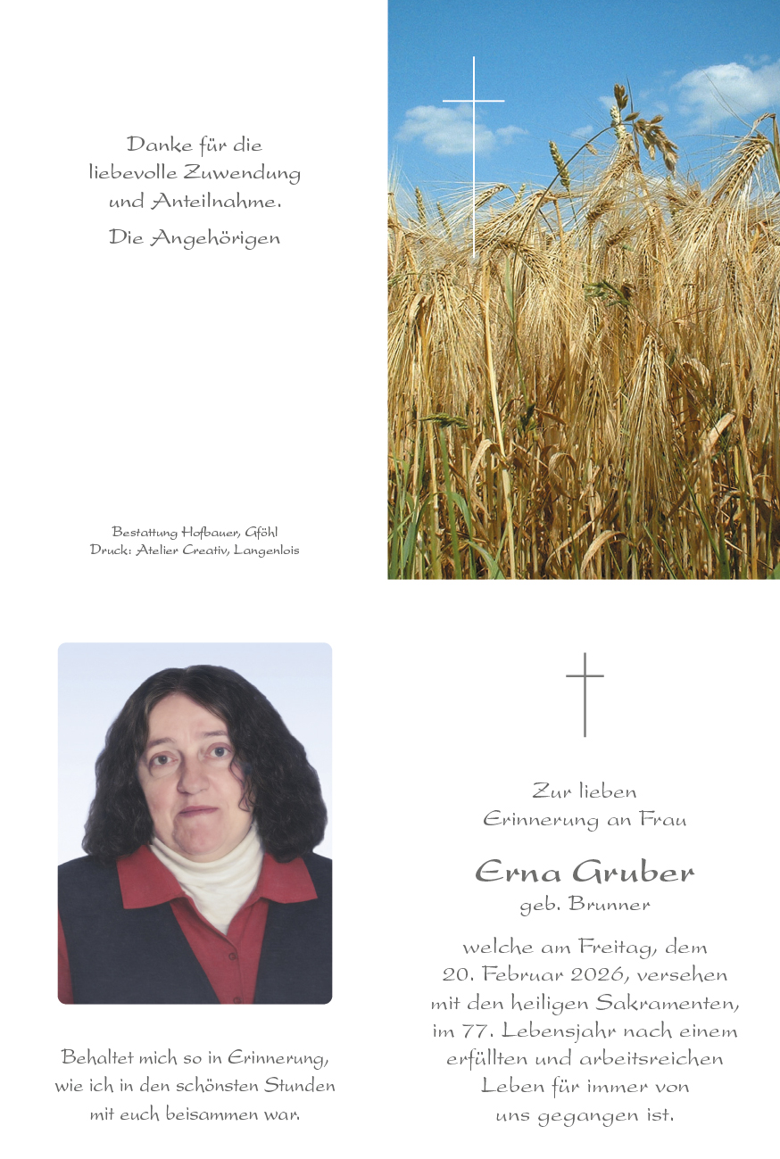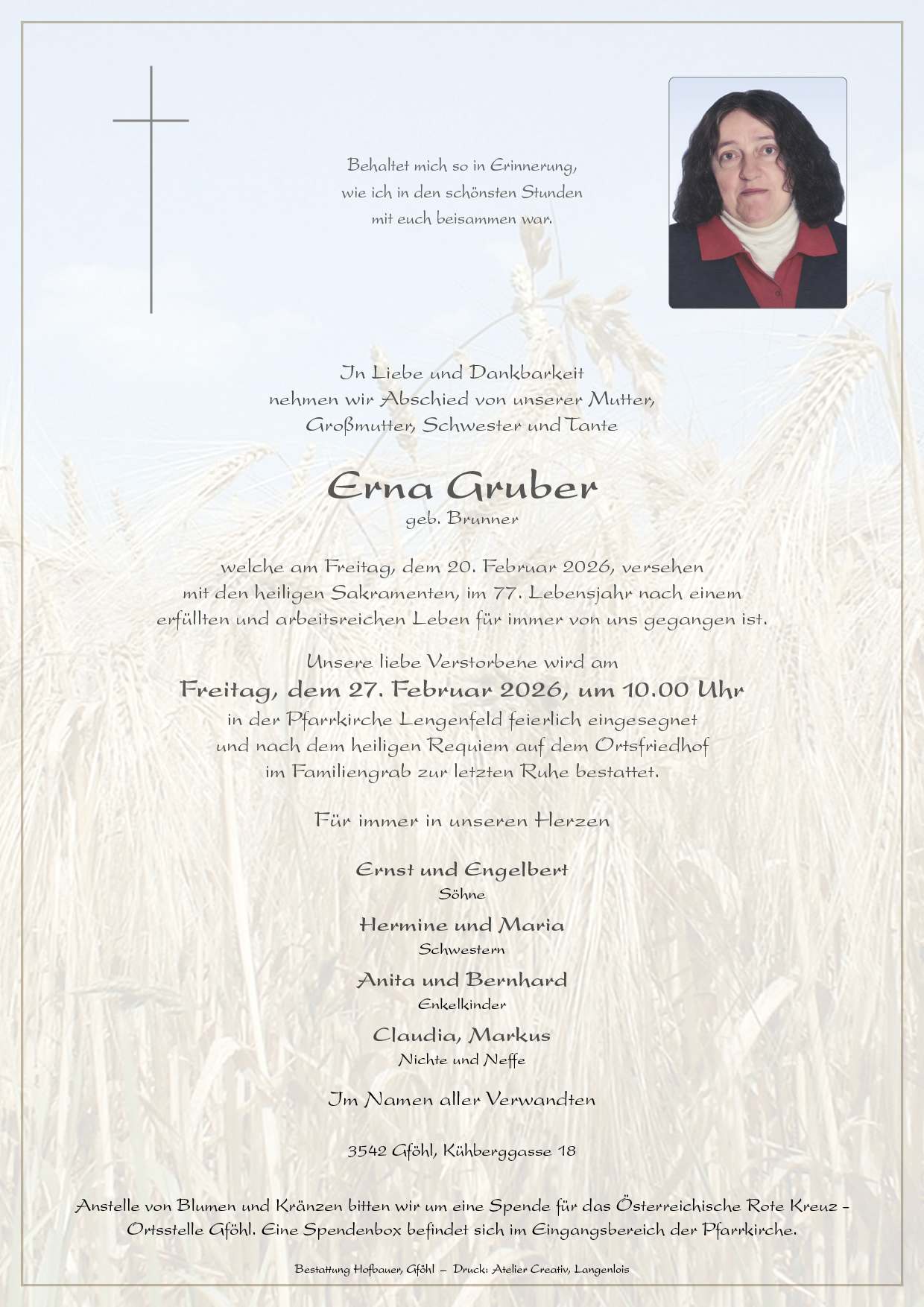 Erna Gruber * 12. Mai 1949† 20. Februar 2026 Begräbnis:Freitag, 27. Februar 2026,um 10.00 Uhr in der Pfarrkirche Lengenfeld Download Parte Download Trauerbild Parte Trauerbild Kerzen Parte Trauerbild Kerzen Hier können Sie eine Kerze anzünden Label Name* Email Label Name* Email 6 Kerzen Inline Feedbacks View all comments Wurzer Lia 9 Tage zuvor Mein Beileid und aufrichtige Anteilnahme der ganzen Familie. Franz Fischer 9 Tage zuvor Mein Beileid Ulli u Kurt Steiner 7 Tage zuvor Unser aufrichtiges Beileid Hilda u. Erwin Tiefenböck 6 Tage zuvor Ruhe in Frieden! Hannes Schmöger samt Mutter 4 Stunden zuvor Wig dsnjfn für die langjährige Treue und übermitteln der gesamten Familie unser aufrichtiges Beileid! Hannes Schmöger samt Mutter 4 Stunden zuvor Wir danken …