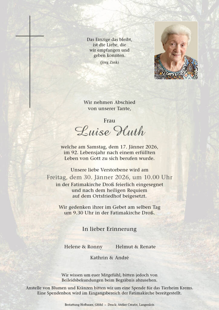 Lebe wohl Tante Luise . Ein letzter Gruß von uns. Unsere aufrichtige Anteilnahme den Angehörigen. Rosi u. Familie