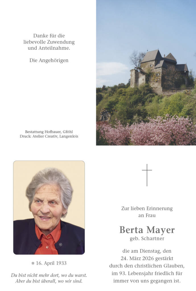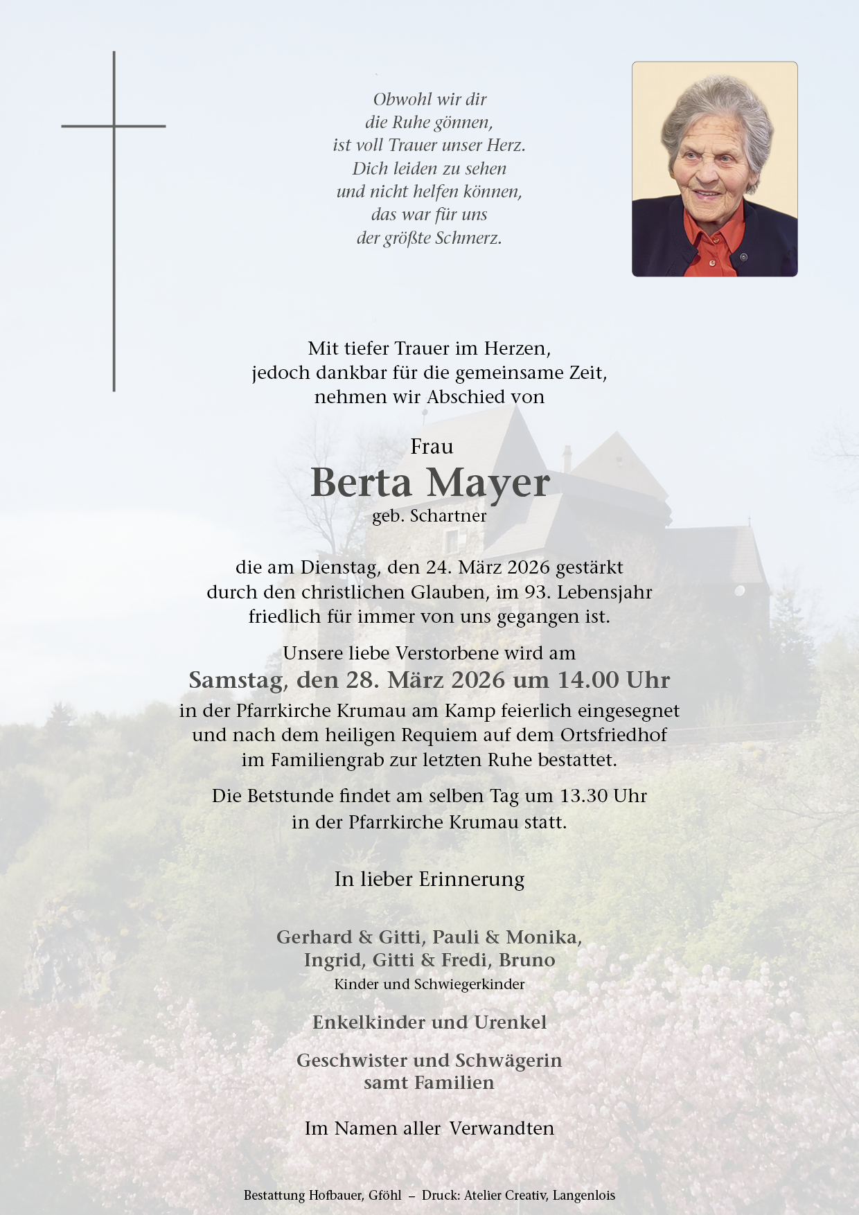 Berta Mayer * 16. April 1933† 24. März 2026 Begräbnis:Samstag, 28. März 2026,um 14.00 Uhr in der Pfarrkirche Krumau am KampBetstunde:am selben Tag um 13.30 Uhr in der Pfarrkirche Krumau am Kamp Download Parte Download Trauerbild Parte Trauerbild Kerzen Parte Trauerbild Kerzen Hier können Sie eine Kerze anzünden Label Name* Email Label Name* Email 9 Kerzen Inline Feedbacks View all comments Nicole Gretzel 20 Tage zuvor Wenn die Sonne des Lebens untergeht,leuchten die Sterne der Erinnerung. Ein Licht für deine letzte Reise Unser aufrichtiges Beileid Nicole und Robert Erna Berner 20 Tage zuvor Mein aufrichtiges Beileid. Helga Tomiska 19 Tage zuvor Ein Licht für die letzte Reise 🕯 Mein aufrichtiges Beileid Monika Patzl 18 Tage zuvor Liebe Brigitte! Herzliches Beileid zum Ableben Deiner Mutter Lieber Fredi! Herzliches Beileid zum Ableben Deiner Schwiegermutter Liebe Lisa! Herzliches Beileid zum Ableben Deiner Großmutter Viel Kraft in der tief traurigen Zeit des Abschiedes. Alles Liebe Monika Patzl Ida Steininger 18 Tage zuvor Unsere innigste Anteilnahme an Euren schweren Verlust Familie Steininger Patrick Windegger 18 Tage zuvor Mein aufrichtiges Beileid. Karl und Rosemarie Fuchs 17 Tage zuvor Liebe Ingrid, liebe Trauerfamilie, unsere aufrichtige Anteilnahme, Karl und Rosemarie Edeltraud Frühwirth 17 Tage zuvor Mein aufrichtiges Beileid und Mitgefühl der ganzen Trauer Familie entbietet . Edeltraud Frühwirth Sandra Maria Königshofer 14 Tage zuvor In stiller Anteilnahme! Mögen Kraft und Trost eure Begleiter sein.