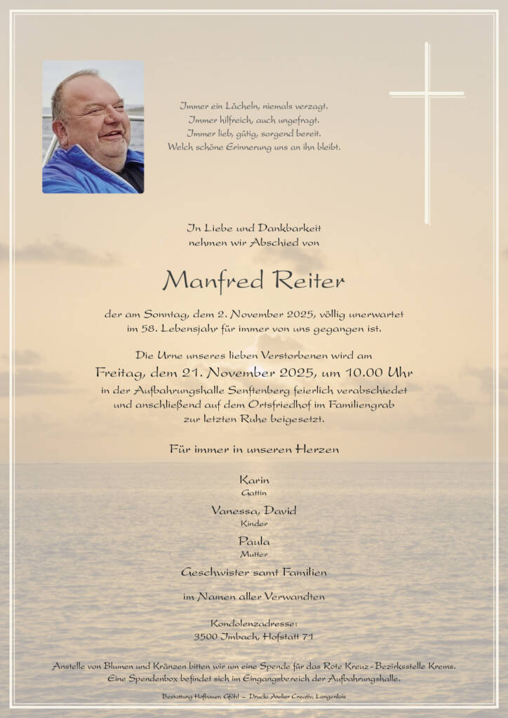 Von Herzen wünschen wir Euch, dass Ihr vor allem die schönen Momente in bleibender Erinnerung behalten werdet. Manfred du warst ein einzigartiger Mensch, wir werden dich nie vergessen. Ein stiller Gruß Fritz und Edith Nigl
