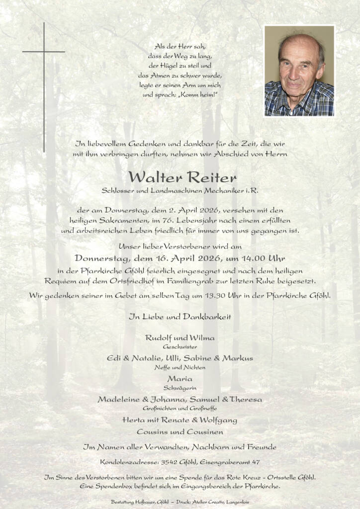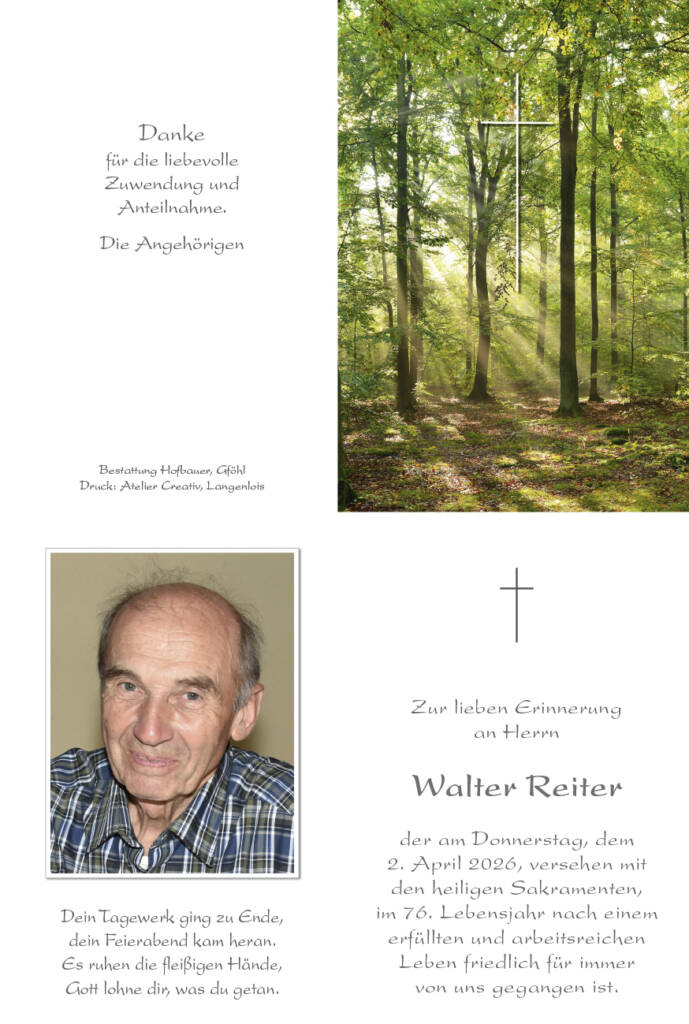 Walter Reiter * 14. September 1950† 2. April 2026 Begräbnis:Donnerstag, 16. April 2026,um 14.00 Uhr in der Pfarrkirche GföhlBetstunde:Donnerstag, 16. April 2026,um 13.30 Uhr in der Pfarrkirche Gföhl Download Parte Download Trauerbild Parte Trauerbild Kerzen Parte Trauerbild Kerzen Hier können Sie eine Kerze anzünden Label Name* Email Label Name* Email 5 Kerzen Inline Feedbacks View all comments Elfi Wieland 6 Tage zuvor Mein aufrichtiges Beileid! Monika Brenner 4 Tage zuvor Ruhe in Frieden! Lezte Grüße von Monika &Viktoria Rudolf Fuchs 1 Tag zuvor Meine Anteilnahme.(kann leider nicht Teilnehmen )Ruhe in Frieden Amen 1 Tag zuvor In lieber Erinnerung! ❤️ M.Völkl 13 Stunden zuvor Walter Ruhe in Frieden.Warst ein ganz besonderer Mensch,zu gut für diese Welt.Mein aufrichtiges Beileid !!!