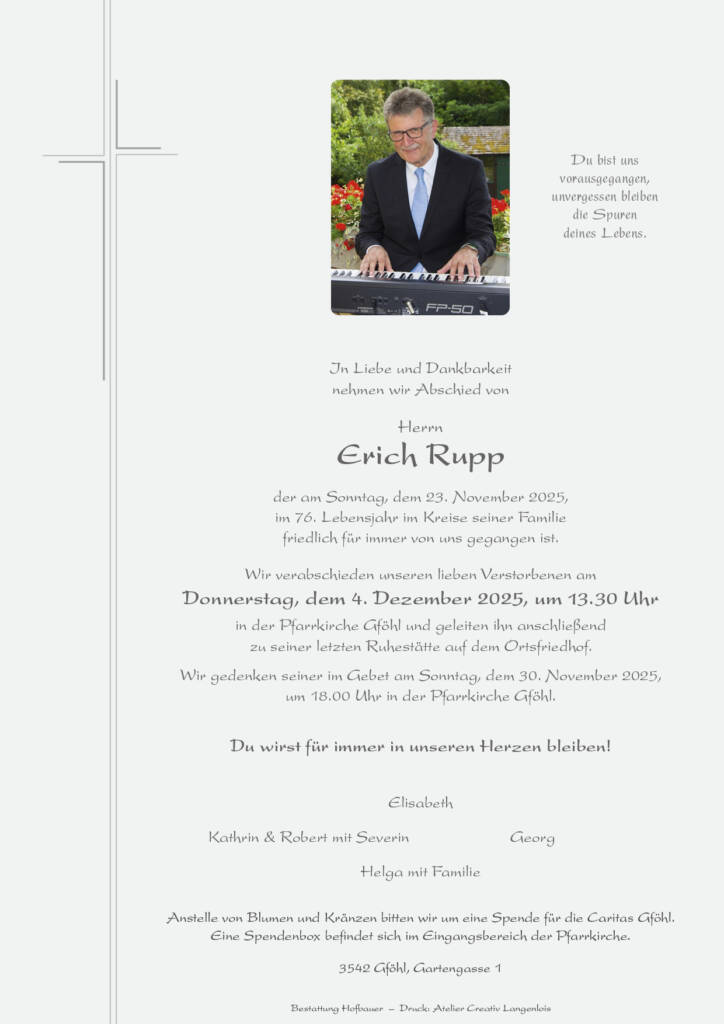 Liebe Familie Rupp! Mein herzliches Beileid und aufrichtige Anteilnahme. Erich wird durch seine Musik und Menschlichkeit vielen Menschen unvergesslich bleiben.