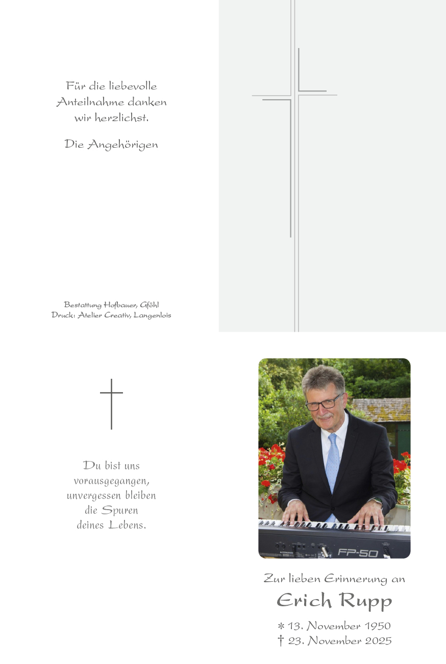 Liebe Familie Rupp! Mein herzliches Beileid und aufrichtige Anteilnahme. Erich wird durch seine Musik und Menschlichkeit vielen Menschen unvergesslich bleiben.