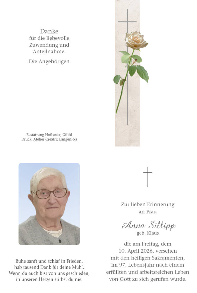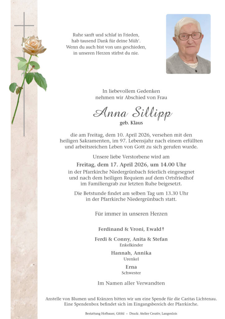 Anna Sillipp * 27. Juli 1929† 10. April 2026 Begräbnis:Freitag, 17. April 2026,um 14.00 Uhr in der Pfarrkirche NiedergrünbachBetstunde:am selben Tagum 13.30 Uhr in der Pfarrkirche Niedergrünbach Download Parte Download Trauerbild Parte Trauerbild Kerzen Parte Trauerbild Kerzen Hier können Sie eine Kerze anzünden Label Name* Email Label Name* Email 5 Kerzen Inline Feedbacks View all comments Sabine Fraberger 1 Tag zuvor Aufrichtige Anteilnahme 🕯🥀 Berndl 1 Tag zuvor Aufrichtige Anteilnahme! Gerald und Maria Berndl Strohmayr Erika 1 Tag zuvor Ein letztes Lebewohl, Aufrichtige Anteilnahme! Familie Strohmayr! Helga und Melitta 1 Tag zuvor Ein Licht für deine letzte Reise 🕯️🌹🌹 Fam. Rogner 15 Stunden zuvor Aufrichtige Anteilnahme.